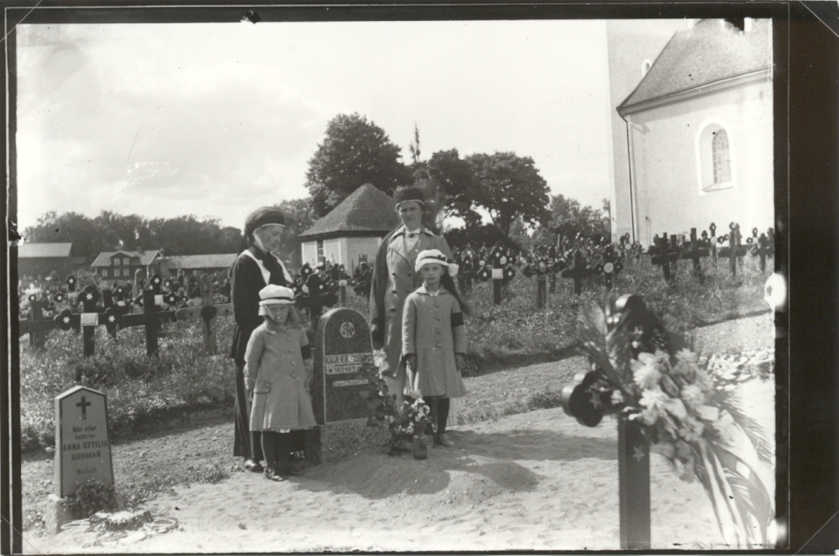 Familj vid Lotten Johanssons gravsten på kyrkogården vid Hjorteds kyrka.