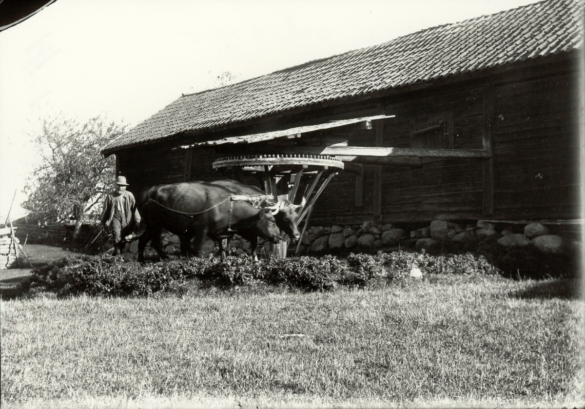 Trösknng med oxar på gammalt vis i Getterum, Sandhorvan.