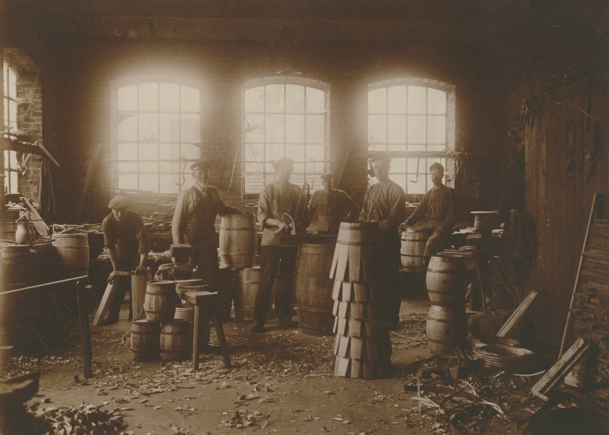 "...från vänster en yngling som håller på att resa en "drittel" (tyskt ord) vid sidan om honom står min farfar N. G. Blomqvist som håller handen på en färdig drittel. Nästa man är min far Karl Blomqvist som håller på att nita ett band till en ekkagge. Något bakom honom vid fönstret står en morbror Axel Franzen och sedan står Albert Blomqvist, som sedan blev den sista ägaren av verkstaden. Framför honom står halvfärdiga ekkaggar, mannen längst till höger är i färd med att tillverka sillfjärdingar, längst till höger syns två färdiga kaggar".