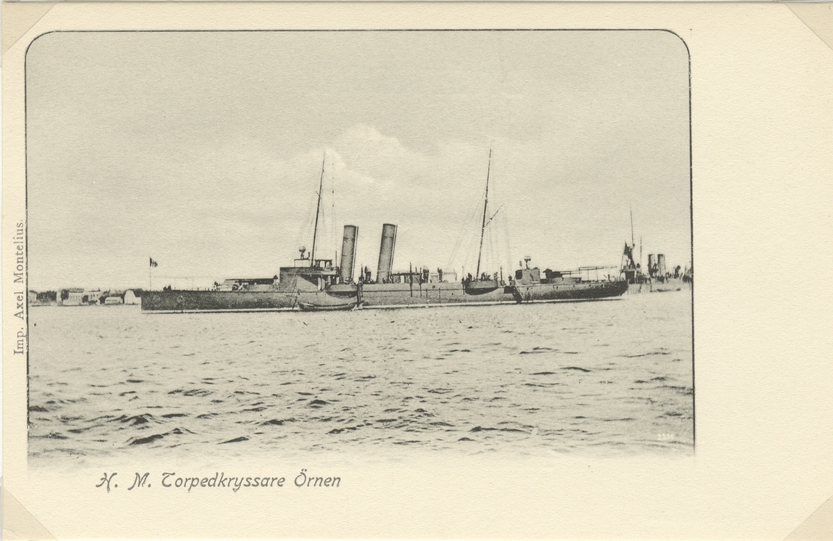 Titel: Torpedkryssaren Örnen. Sjösatt: 6/8 1896 Färdigbyggd: 4/5 1897 Varv: Lindholmen, Göteborg Konstruktör: G W Svensson Dimensioner: L i vl 67,7 meter Bredd 8,2 meter Djupgående 3,0 meter Deplacement: 700 ton Besättning 4000 indicerade hästkrafter Fart: 19,0 knop Bestyckning 2 st 12 cm kanoner 4 st 57 cm kanoner 1 st 38 cm torpedtub Enligt H. Wrangel: Svenska Flottans Bok sidan 236-237