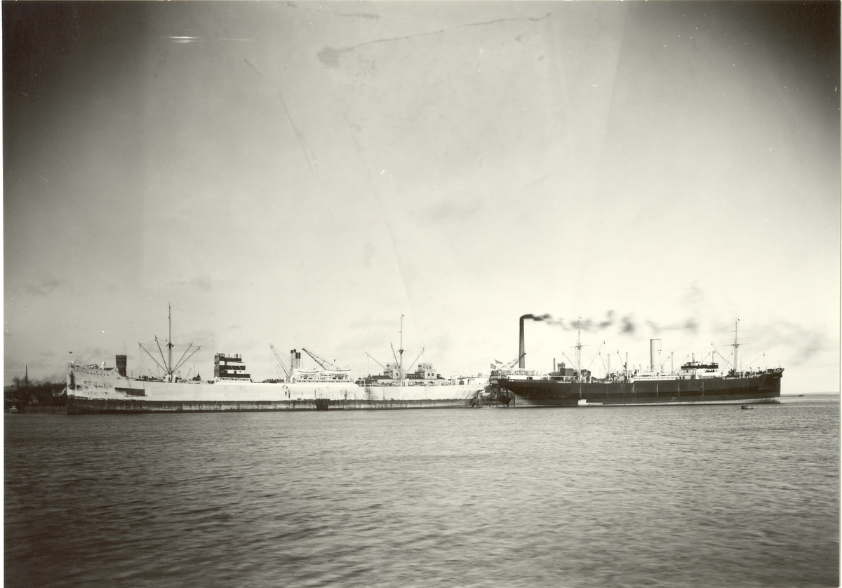 Två fartyg vid kaj vid Barlastholmen. Kalmar ångkvarn ses i bakgrunden.