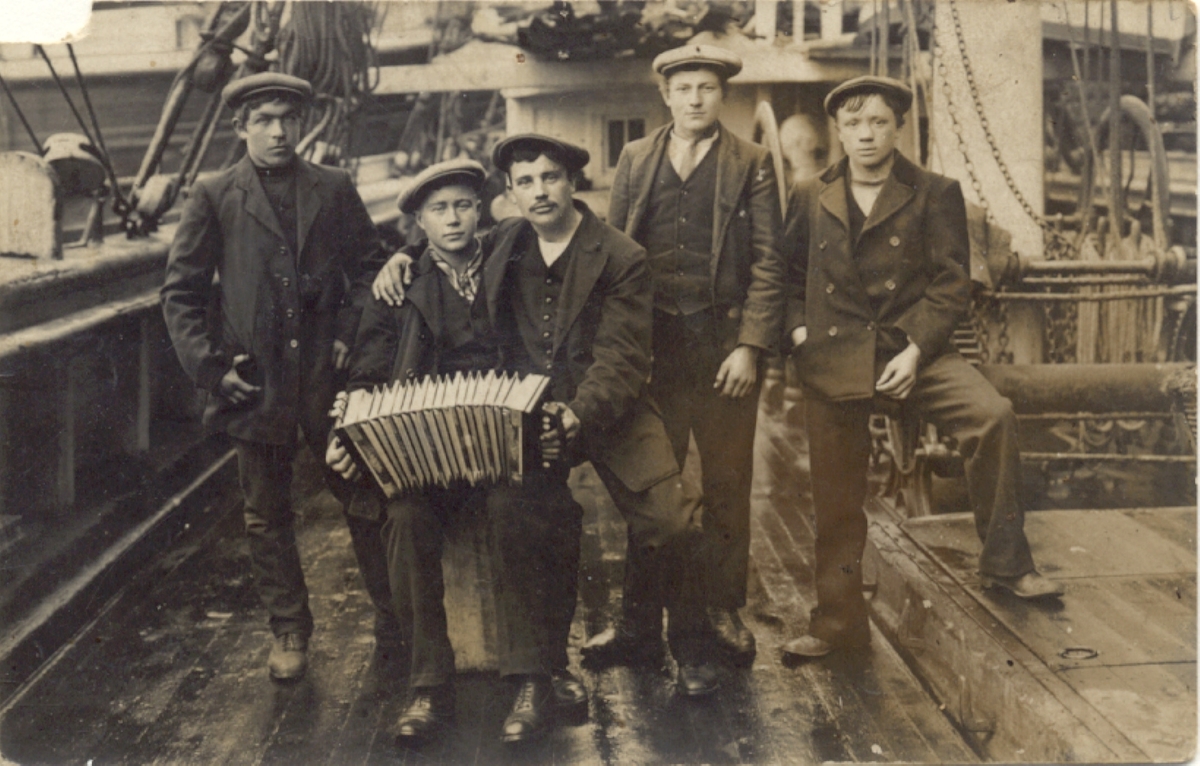 Skonertskepp. Besättning, fotograferad i West Haqrtlepool i mars 1912.. Kortets adressat är Gustav Persson, Kalmar. Avsändare är Viktor Johansson, Bwergkvara, som lär vara med på vinden.