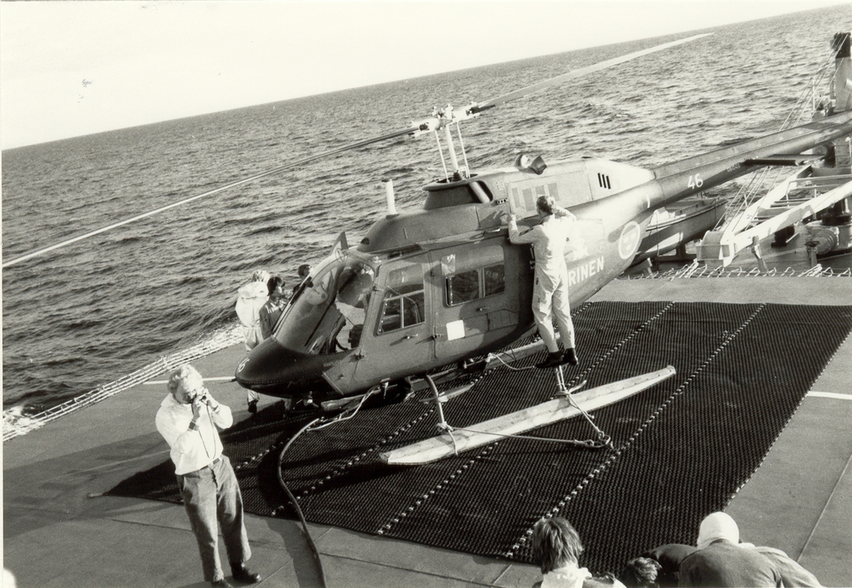 Helikopter landar ombord i minfartyget "Visborg" 1970-talet.