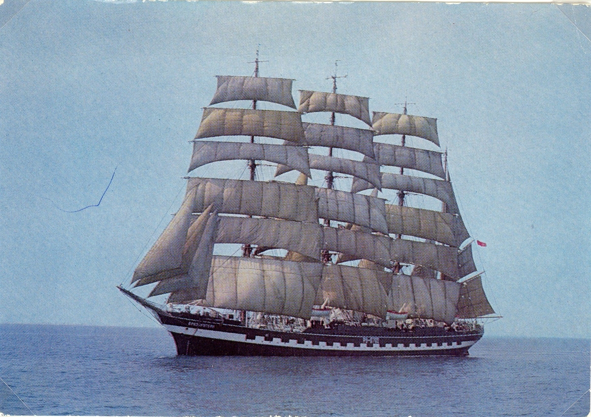 Den fyrmastade barken Kruzenstern under fulla segel. Fartyget byggdes 1926 i Bremerhaven och seglade under namnet Padua fram till kriget på vetetraden Europa-Australien. hon ägdes då av Gustav Erikssons på Åland rederi och tillerkändes 1946 Sovjet som del av krigsskadeståndet. Sovjet gav fartyget namnet Kruzenstern efter världsomseglaren Adam Johan K. och använde henne som utbildningsfartyg för den sovjetiska fiskeflottan. Nu är hon rysk och seglar som skolskepp med Kaliningrad som hemmahamn. Kruzenstern är, näst efter Sedov, världens största fyrmastade bark. Två av hennes systerfartyg, Pommern och Passat, ligger som museifartyg i Mariehamn och Travemünde.