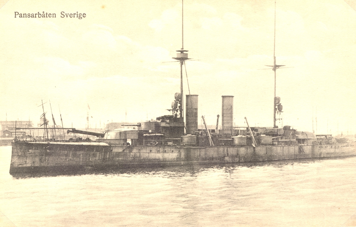 Pansarbåten Sverige. Byggdes för pengar som samlades in av svenska folket efter Gustav V:s s.k. borggårdstal 1914. Regeringen Staaf hade stoppat ett pansarbåtsbygge med hänvisning att det blev för dyrt.