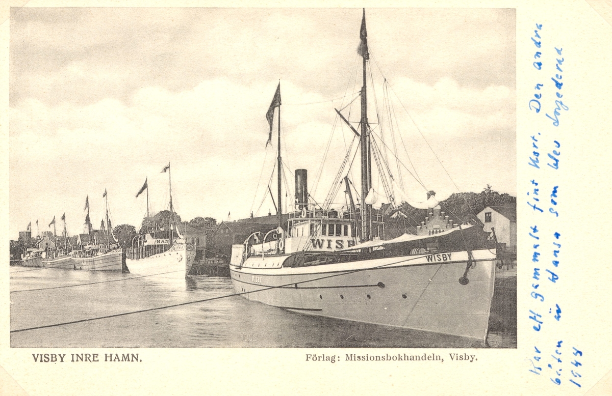 Visby i Visbys hamn samt Hansa som blev torpederad 1944.