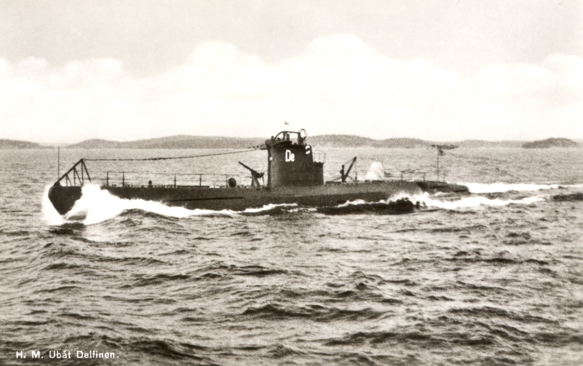 H M Ubåt Delfinen. Minubåt. Sjösatt 1936. Deplacement i övervattensläge 580 ton. Fart i övervattensläge 15 knop. Bestyckning: lv-pjäser, torpedtuber samt minor. Systerbåtar: Nordkaparen och Springaren.