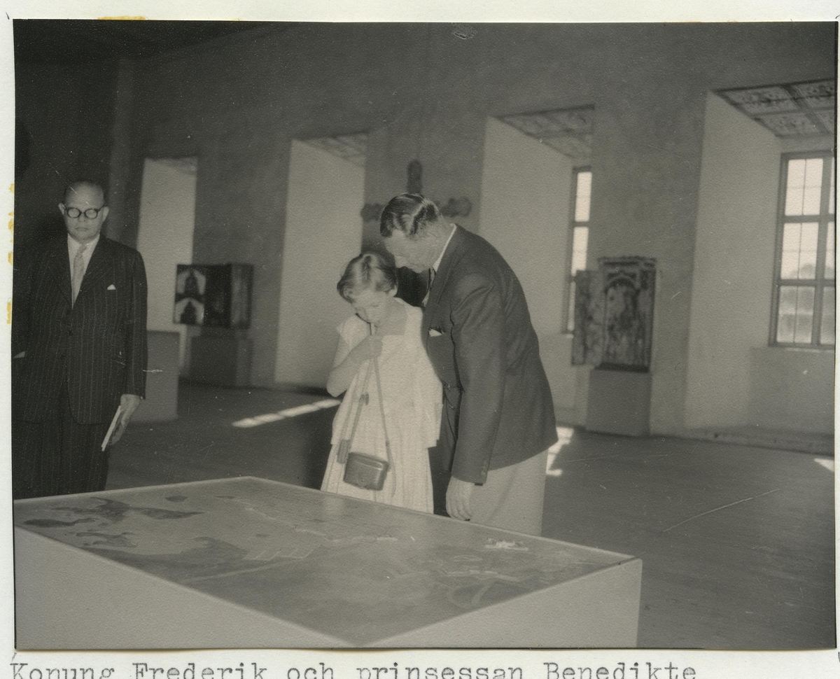 Konung Frederik, prinsessan Benedikte och landshövding Wagnsson i Gröna salen på Kalmar slott.