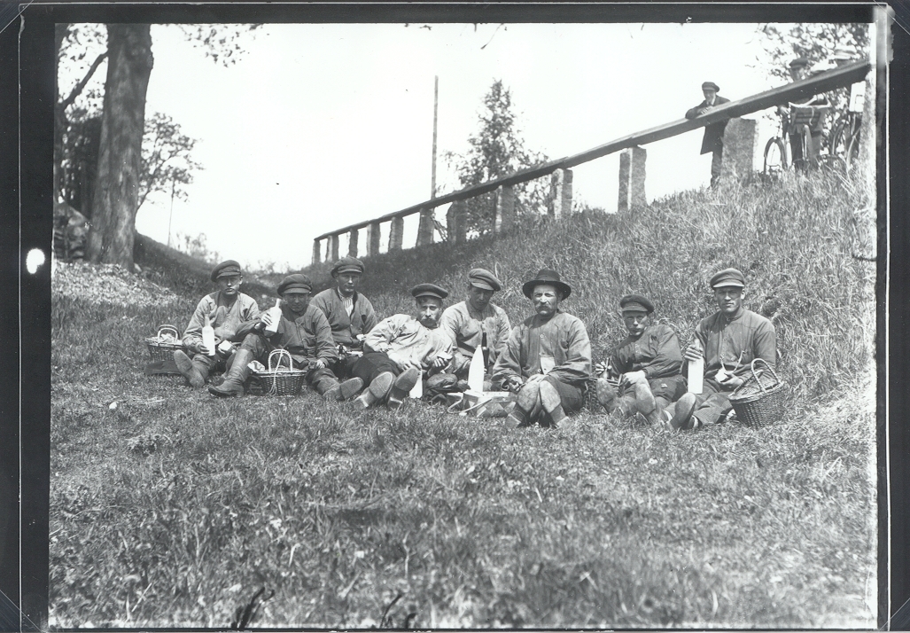 Flottare tar rast från arbetet vid brukspatron Johan Tillbergs säteri i Hjorted 1916.