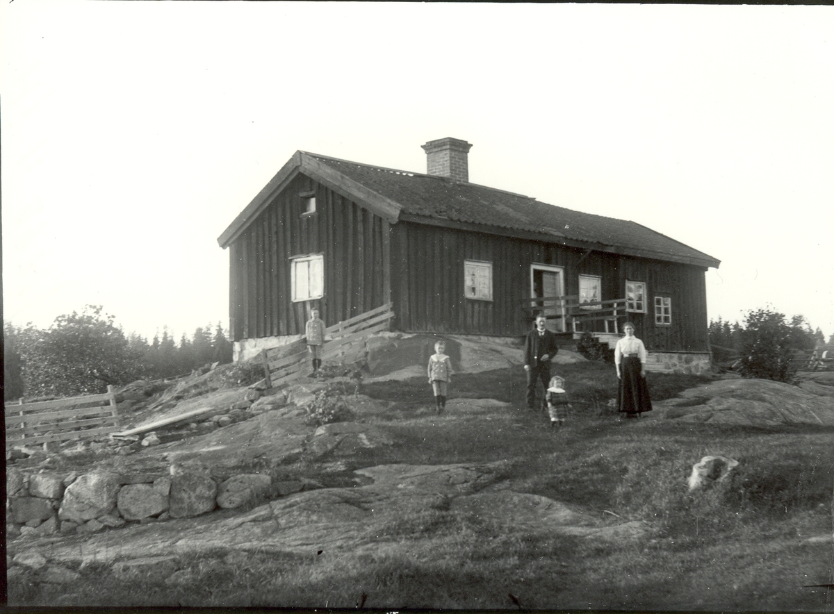 En familj som poserar utanför sin parstuga i Gölghult 1920.