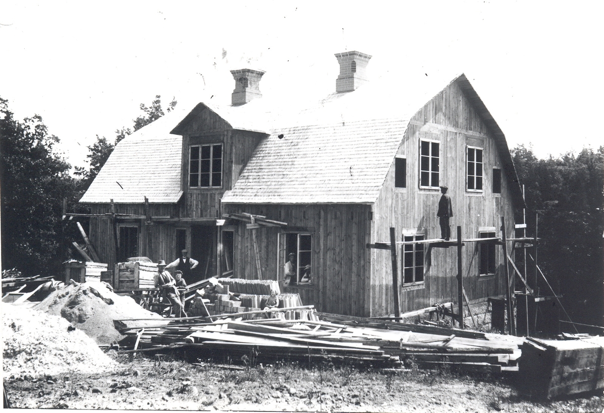 Strömsgården i Solstadström under byggnad. Frontespisen ändrades senare till balkong varvid mittersta fönstret ersattes med dörr. Vid gaveln på ställningen ses Torsten Johansson.