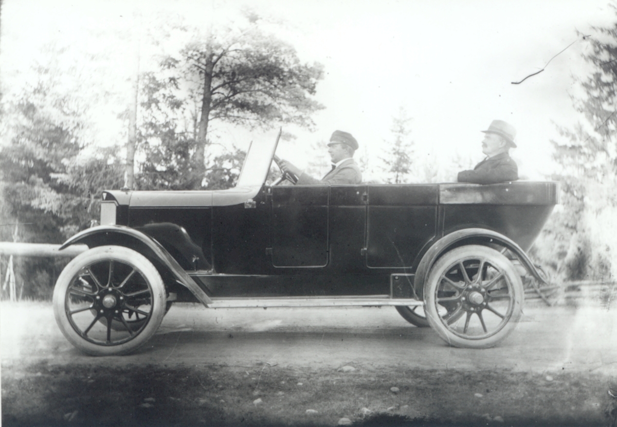 Misterhults egendom. Bilen ägdes av Misterhults egegndom. Troligen av märket Thulin. I baksätet förvaltare Gustav Karlberg, Egendomen. Vid ratten chaufför Eriksson. (Bilen kan även vara tysktillverkad av märket Rudolf Ley. Spetsig kylare och sufflettlåda).