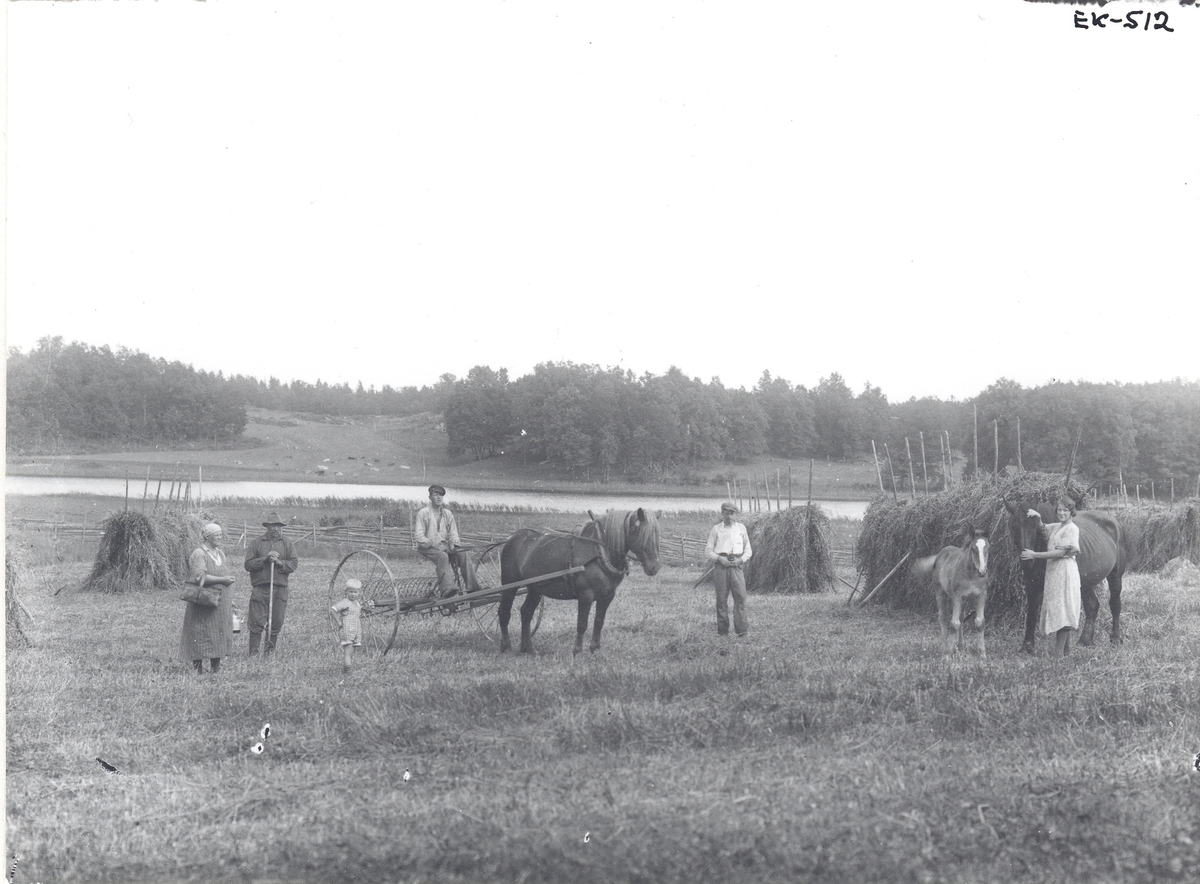 Höbärgning. Från vänster makarna Axelina och Karl Nilsson med sonen Karl-Erik. På hästräfsan sonen Göte. Framför hässjorna: Tage Karlsson, dräng på gården samt Ulla Nilsson, dotter på gården.