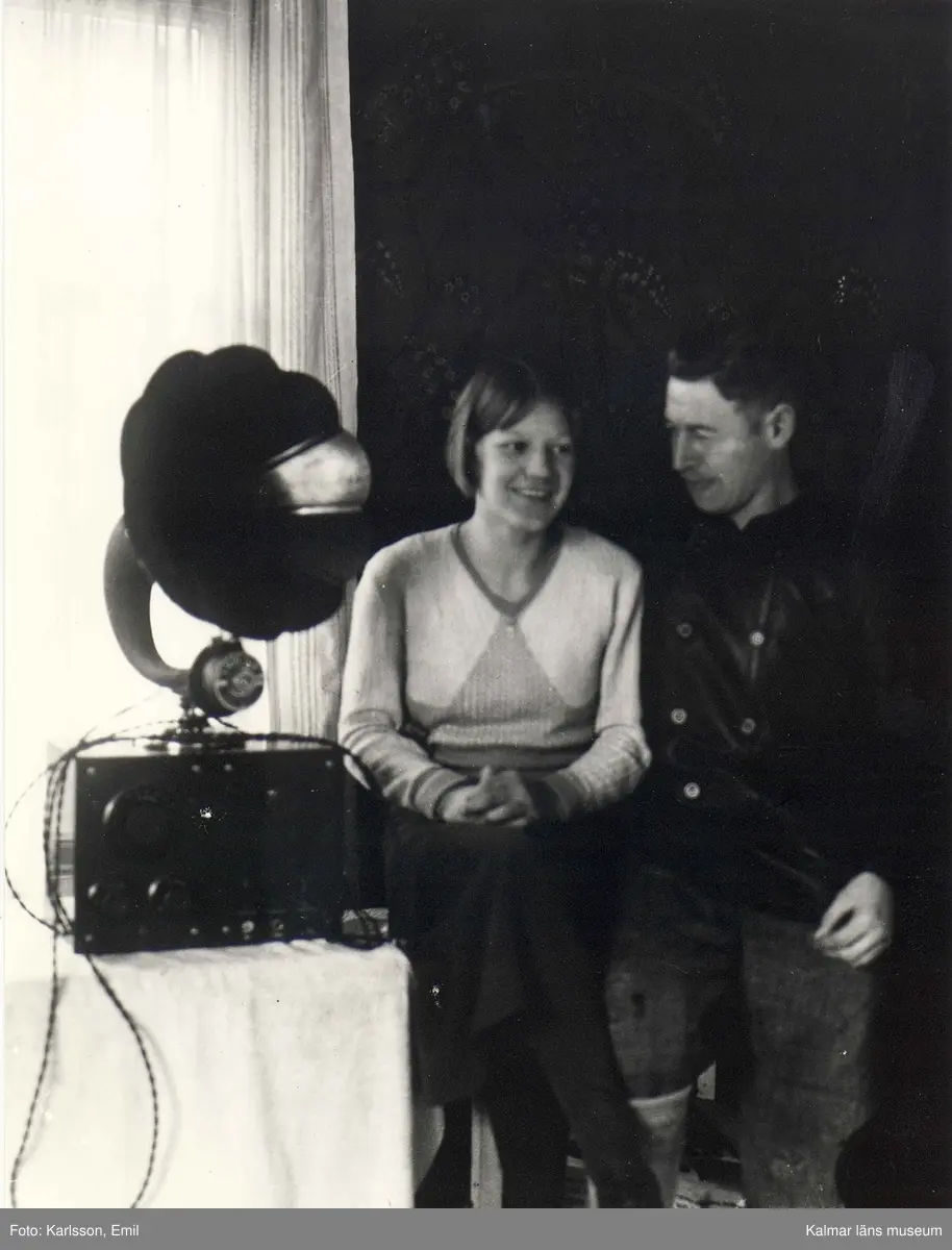 Emil Karlsson tillsammans med sin granne Greta Alexandersson, dotter till målaren Johannes Alexandersson, Mörtfors. Särskilt skall observeras den fina rundradioapparaten samt att Emil dragit för gardinen för att dämpa det infallande ljuset.