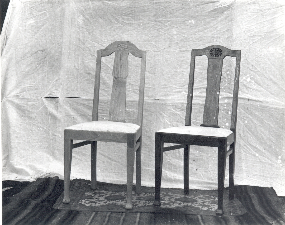 Vid Mörtfors Möbelfabrik tillverkades mängder av stolar under åren 1914-1930. Här prov på två modeller. Stolarna troligen ritade av kamrer Karl-Axel Bjurstam.