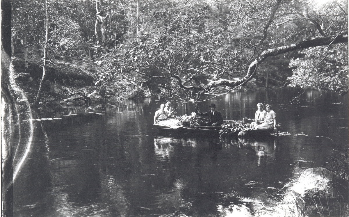 Emil Karlsson vid årorna på roddtur med sommargäster. Troligen har man varit ute och brutit löv eftersom stora ruskor ligger i båten.