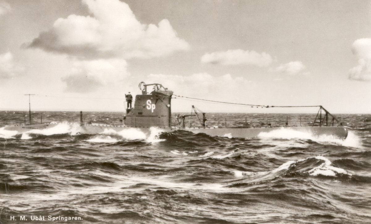 H M Ubåt Springaren. Minubåt. Sjösatt 1935. Deplacement i övervattensläge 540 ton. Fart i övervattensläge 15 knop. Bestyckning: lv-pjäser, torpedtuber samt minor. Systerbåtar: Delfinen och Nordkaparen.