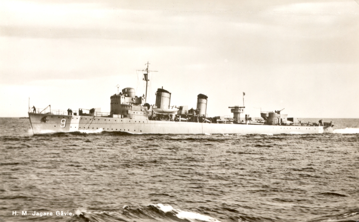 HM Jagare Gävle. Sjösatt 1940. 1040 ton. Fart 39 knop. Bestyckning: tre 12 cm Kanoner, lv-pjäser samt torpedtuber.