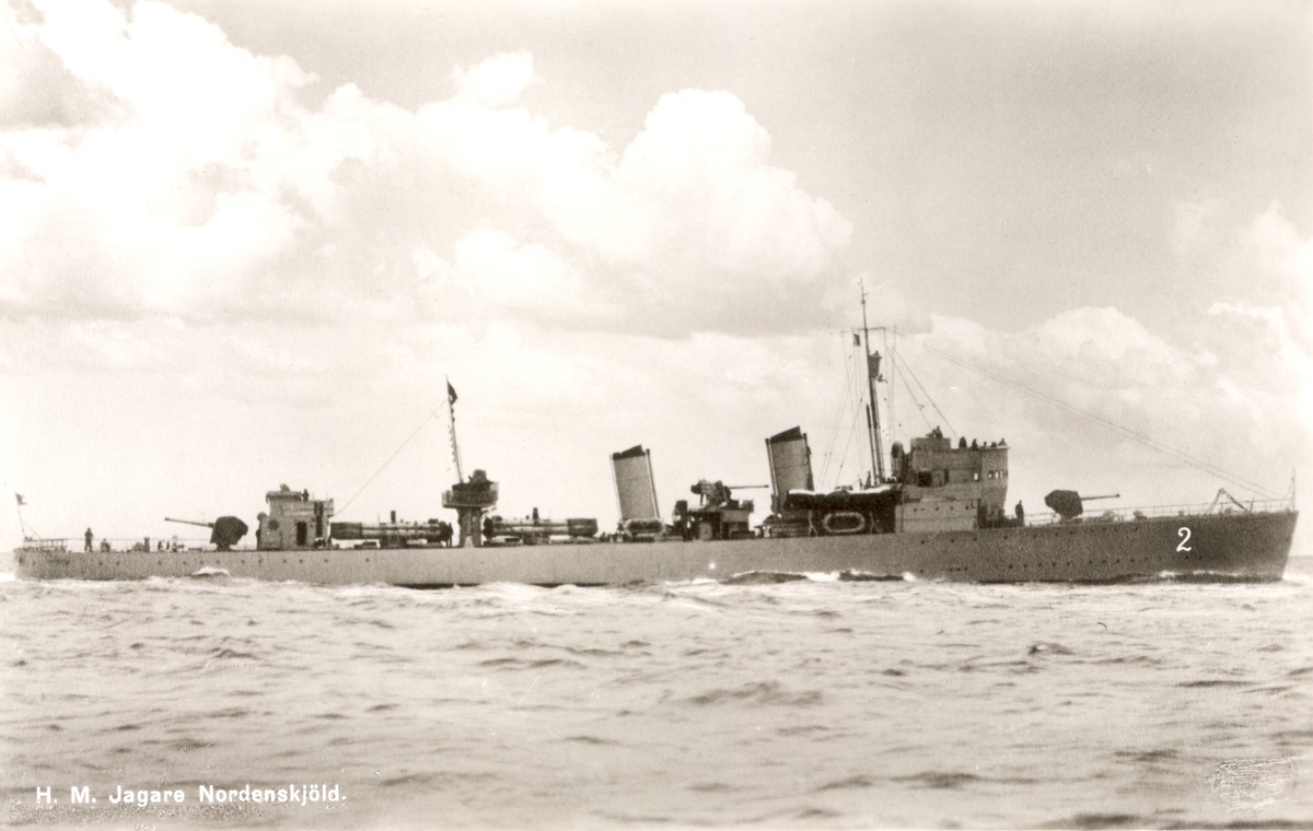 HM Jagare Nordenskjöld. Uppkallad efter Otto Henrik Nordenskjöld, i egenskap av flaggkapten, den verklige ledaren av "stora flottan" under kriget mot Ryssland 1788-90. Sjösatt 1926. 940 ton. Fart 35 knop. Bestyckning: tre 12 cm kanoner, lv-pjäser, torpedtuber samt minor.