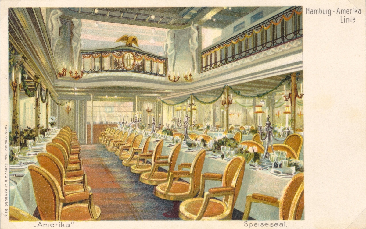Matsalen ombord på Amerika. Hamburg- Amerika-linjen.