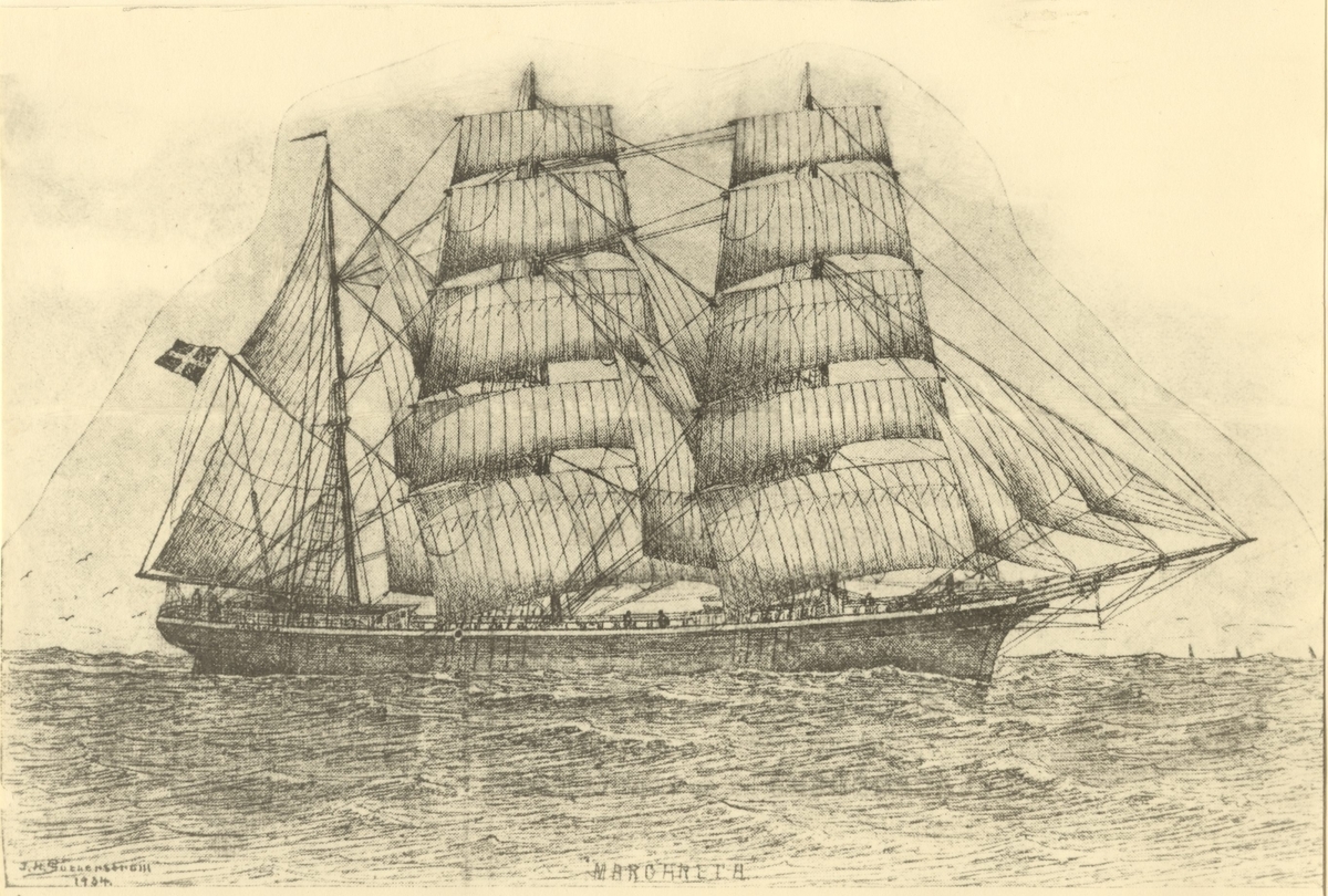 Margareta, bark. Teckning av j.H.Götherström 1934. Foto efter kliche, H.Sage , Figeholm.