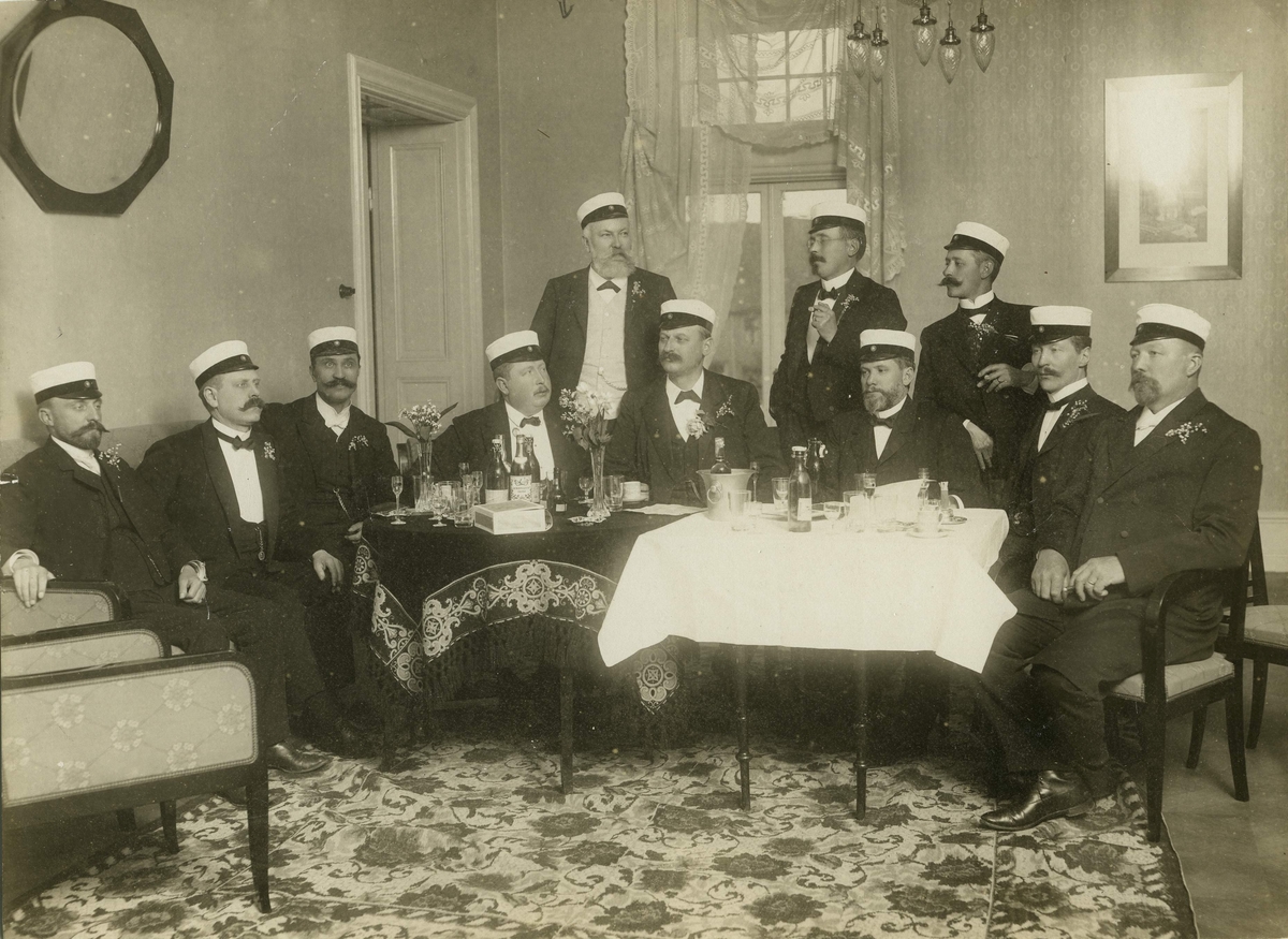 Läroverket i Kalmar, studentjubileum 1905-1910. Tredje man från vänster: Rundkvist. Stående från vänster: bankkassör.