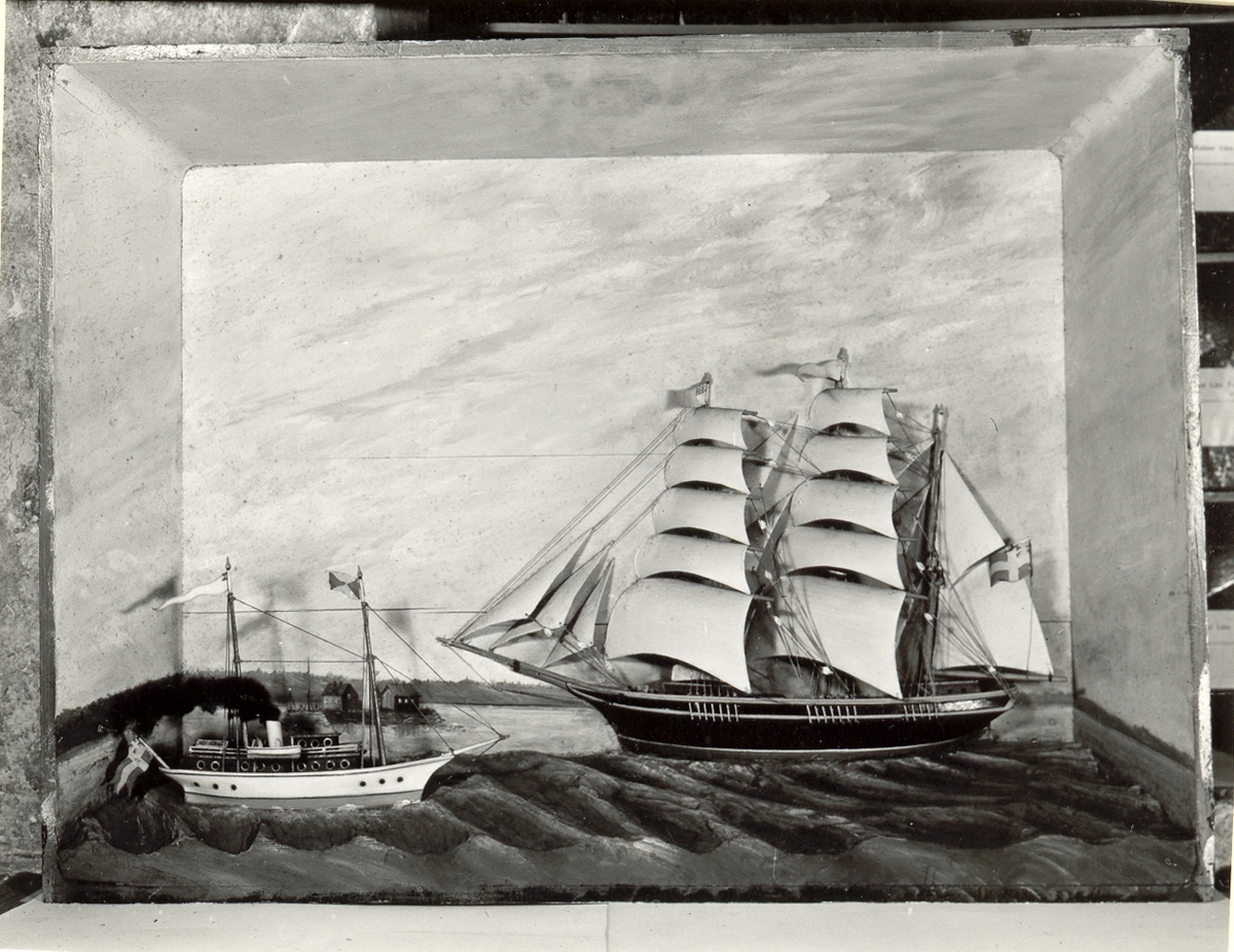 Halvmodell i låda. Barkskepp med namnet Ingrid i vimpeln. Ångbåt med örlogsflagg och S i koret och namnet Carl i vimpeln. Fingerade namn?