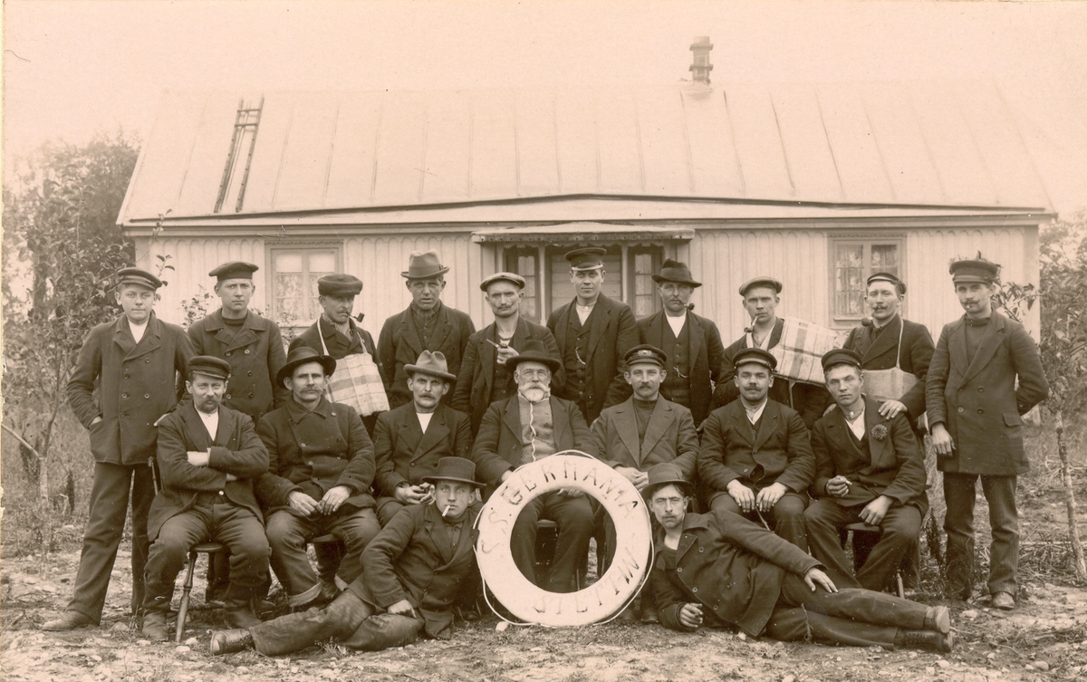Kapten (Köhler) och besättning. Foto i Bergkvara? Efter haveri?