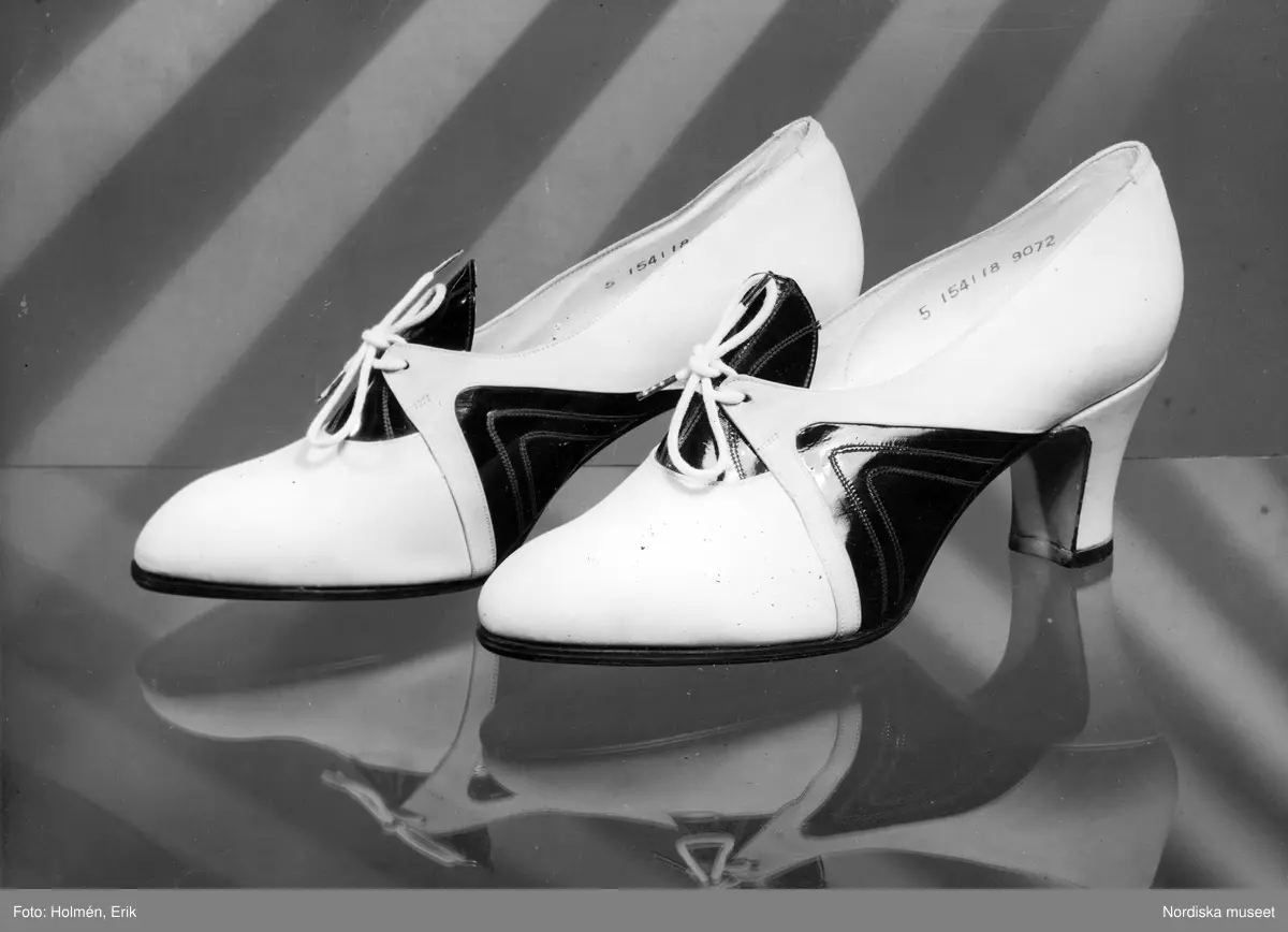 Damskor i vit mocca med svart lackgarn eller blå chevreau-isättning.