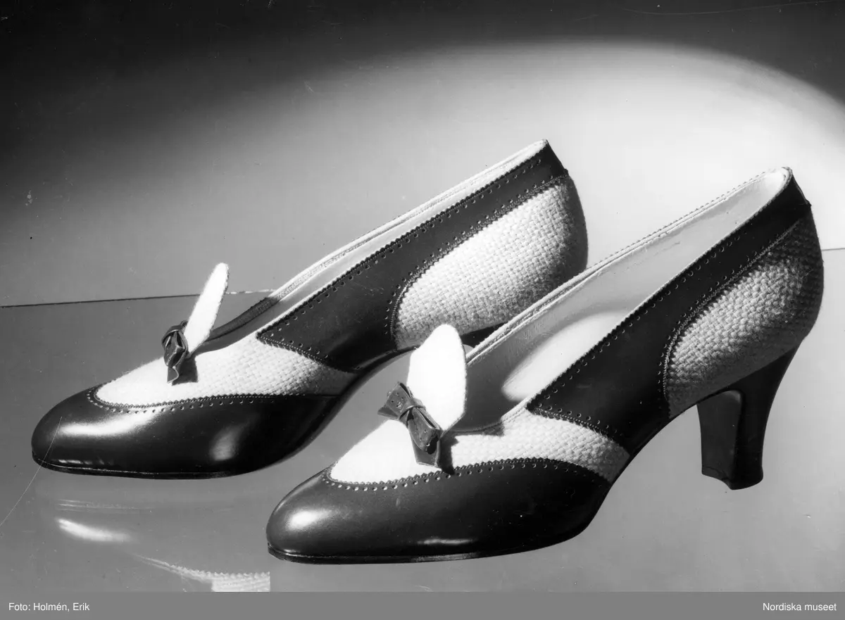 Pumps av sandfärgad javavävnad med garnering av brun boxkalv.