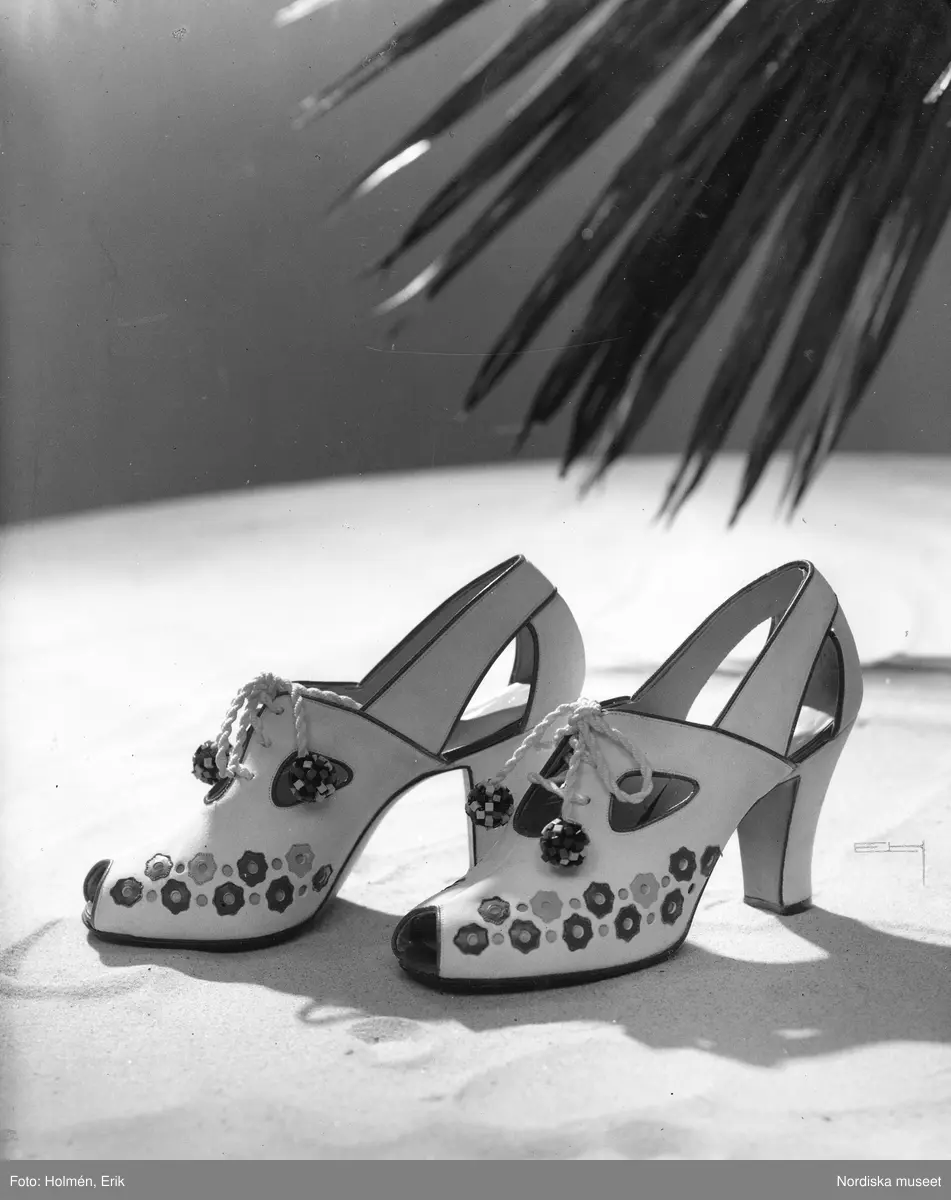 Strand- och promenadskor med öppen tå, blomapplikationer och snörning. Sandstrand och del av palm.