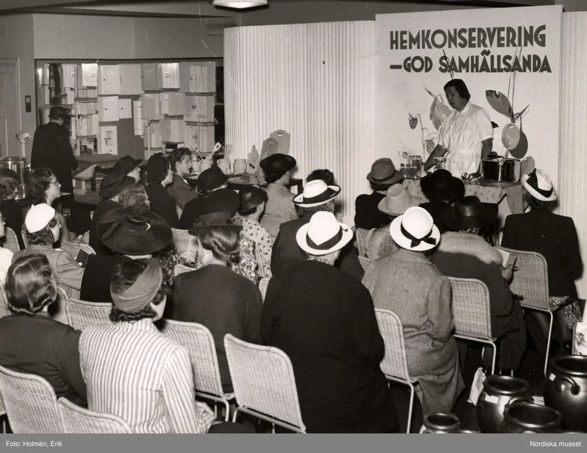 Föredrag. En kvinna står i en talarstol framför en publik med hattklädda damer. Bakom henne syns texten "HEMKONSERVERING - GOD SAMHÄLLSANDA".