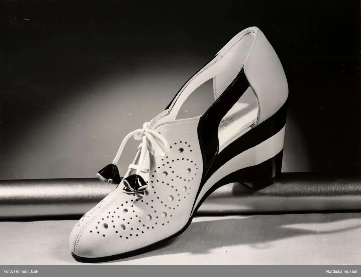 Skomode visas på Nordiska Kompaniet 1941. Ett par tvåfärgade damskor med halvhög kilklack, perforerat hålmönster och knytning.