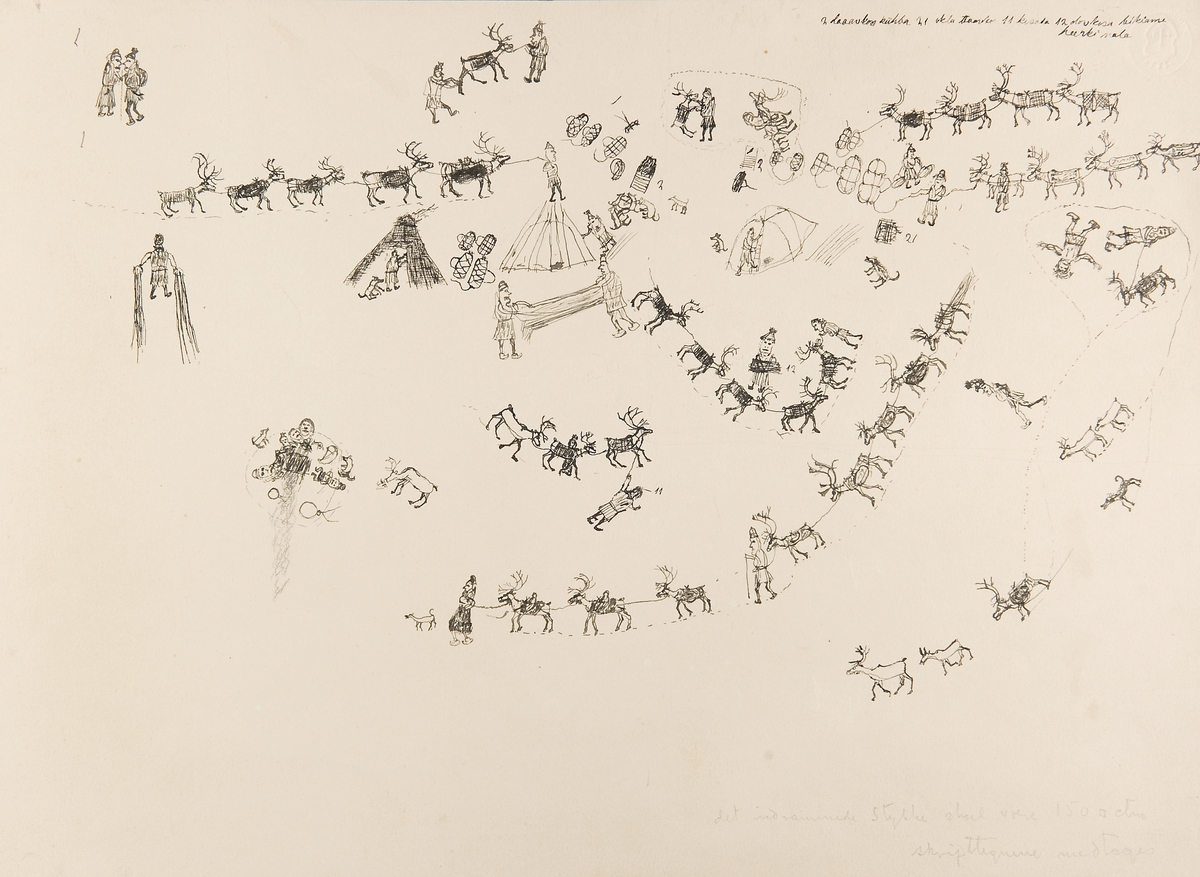 "Torne lappmark. Jukkasjärvi socken.Talma lappby. Teckning av Johan TuriL.A. 853 nr. 6". Samiskt läger med renar, kåtor och människor som sköter diverse sysslor.