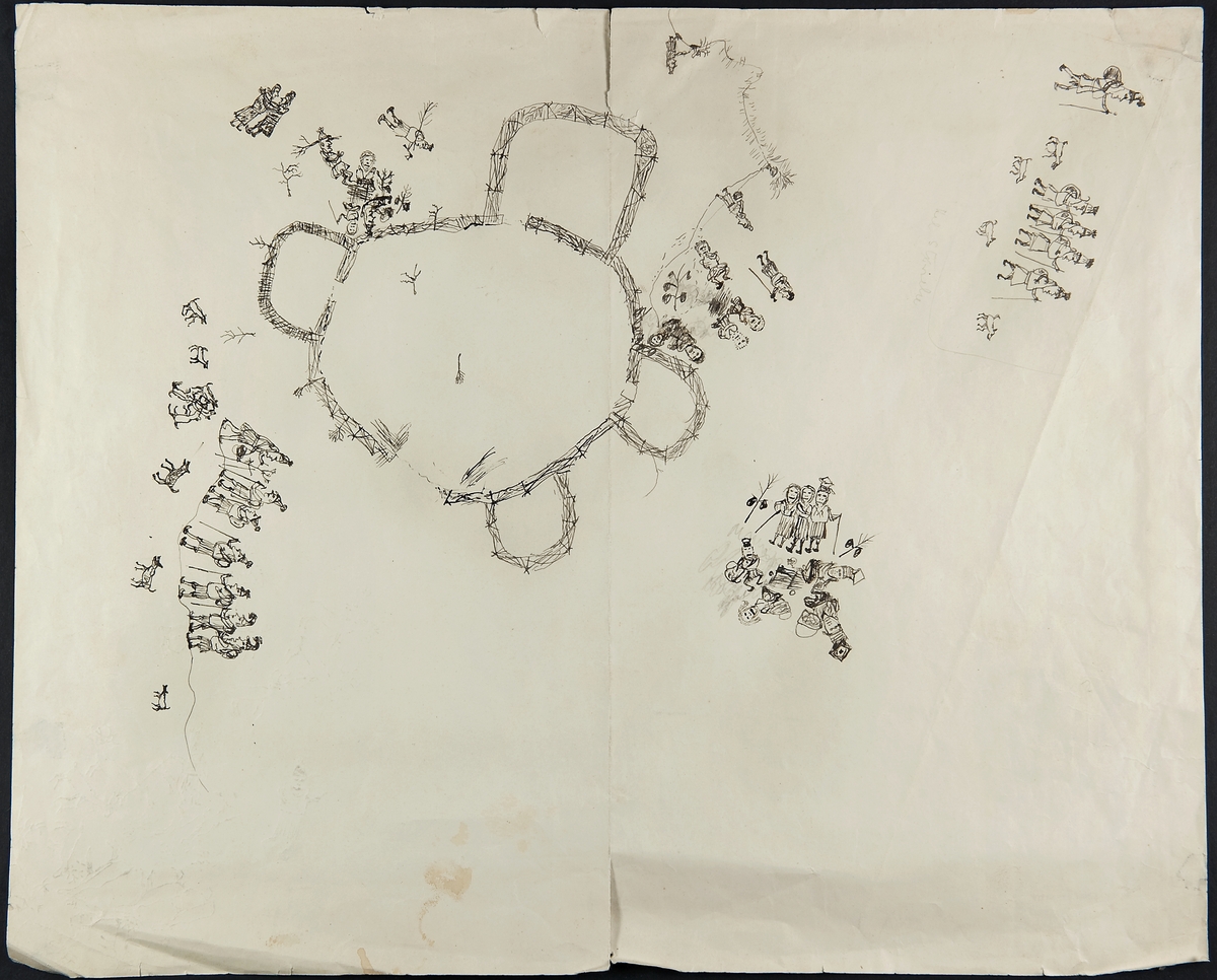 "Torne lappmark. Jukkasjärvi socken.Talma lappby. Teckning av Johan TuriL.A. 853 nr. 8". Ovanifrån perspektiv med grupperingar av människor och hundar, stående runt inhägnad?