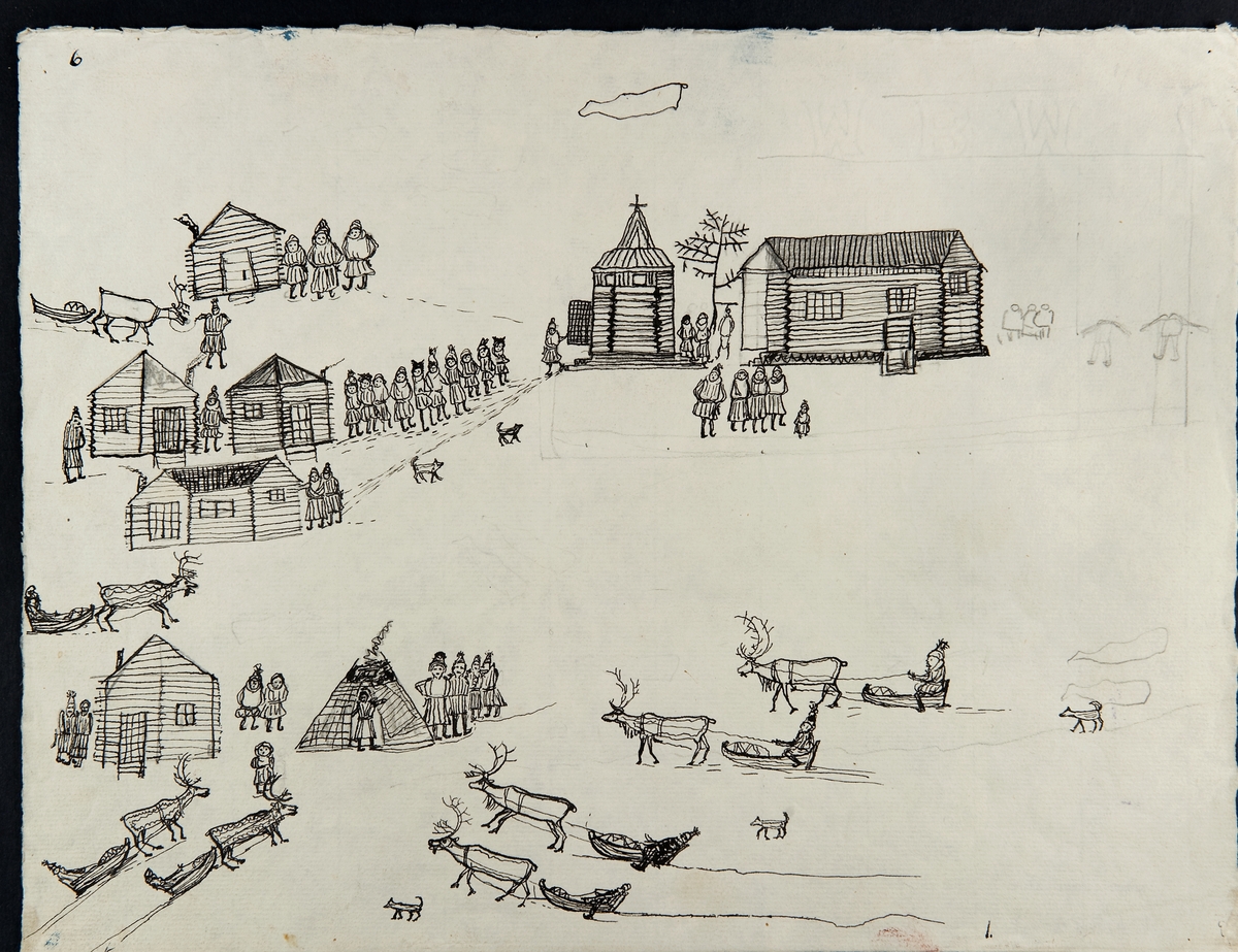 Skilda lappmarker. Teckning av Johan Turi. L.A. 874 nr. 5. Människor i samisk folkdräkt samlas i bebyggelse med kyrka och andra hus. Några kommer i akkja dragen av ren.