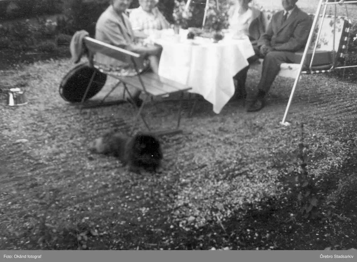 Kaffestund i trädgård med hund, 1965-1970