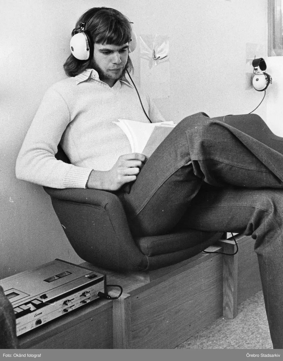 Elev i musikhörnan i Risbergska skolans bibliotek, 1970-tal