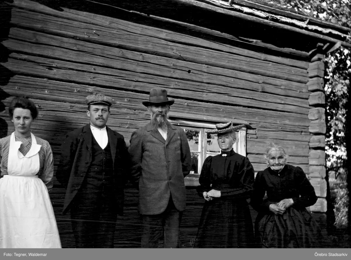Grupp framför gammal stuga, september 1907