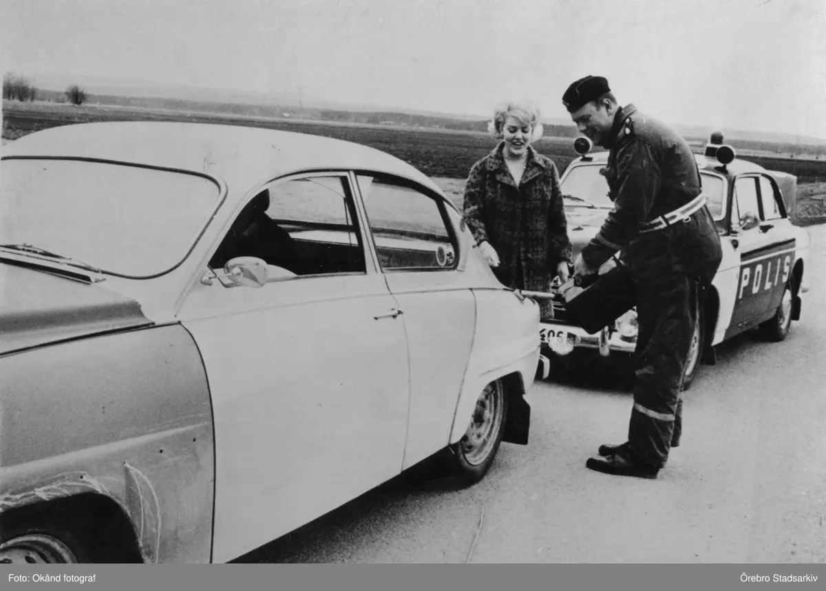 Polisman hjälper trafikant att tanka, 1960-tal