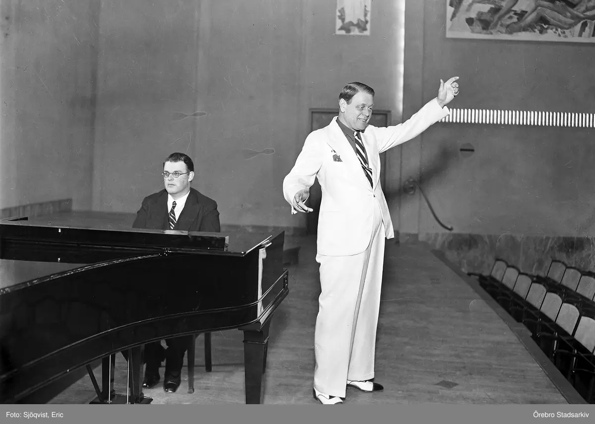 Allsångsledare Lilja med pianist i Konserthuset, 1938