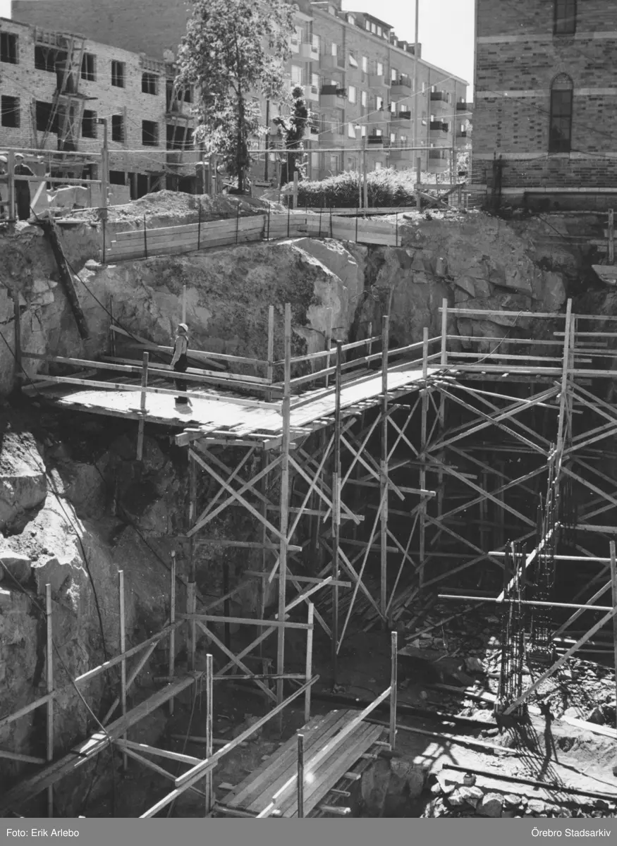 Byggnadsställning när polishuset byggs, 1955-07-29