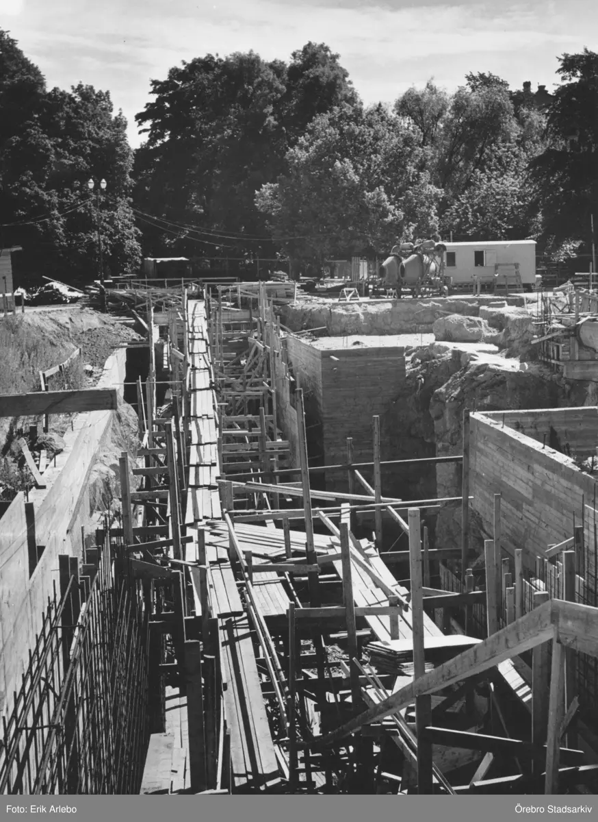 Smal gång för byggarbetarna vid nya polishuset, 1955-07-29