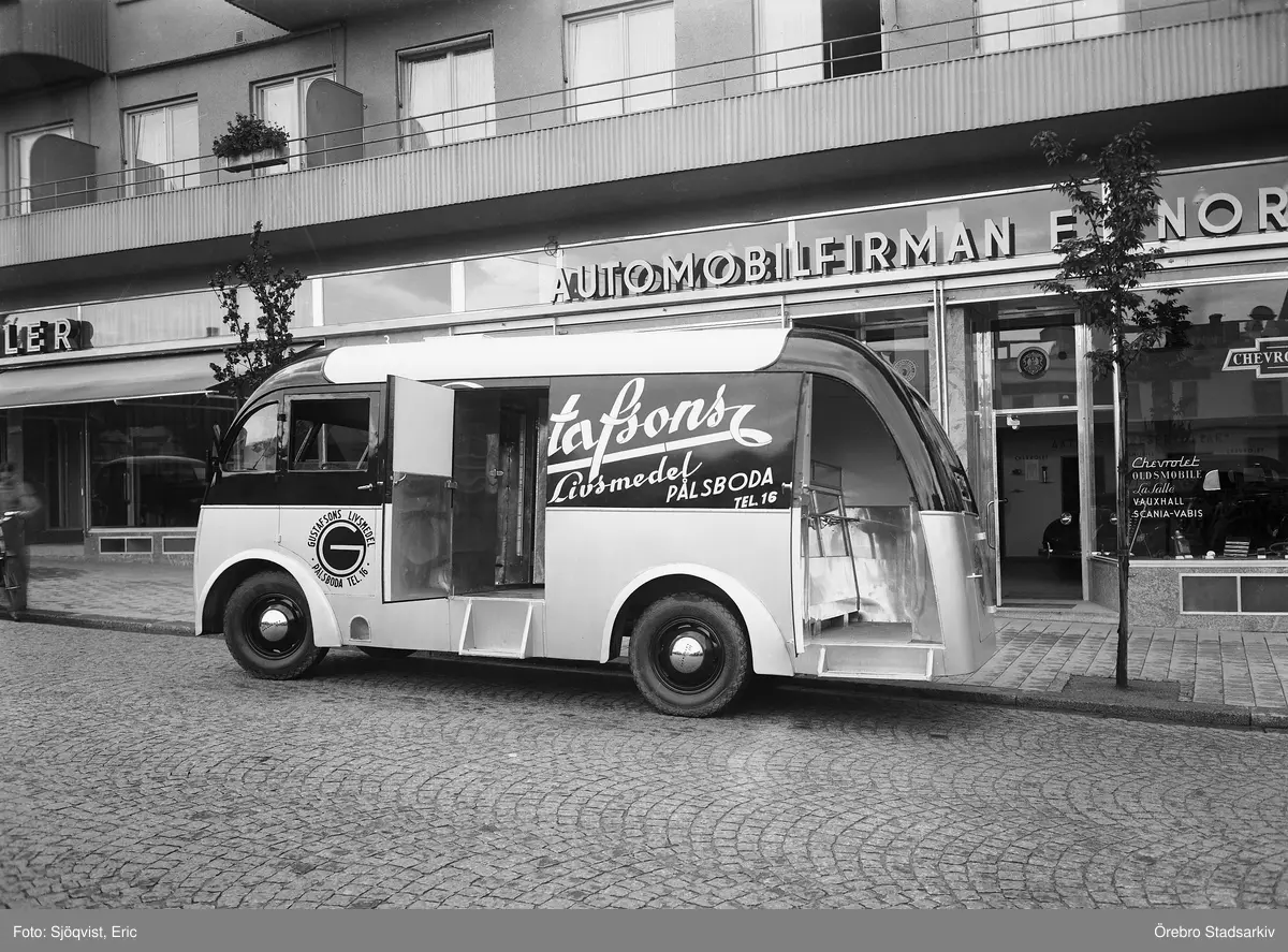Livsmedelsbuss utanför Normans bilaffär, 1939