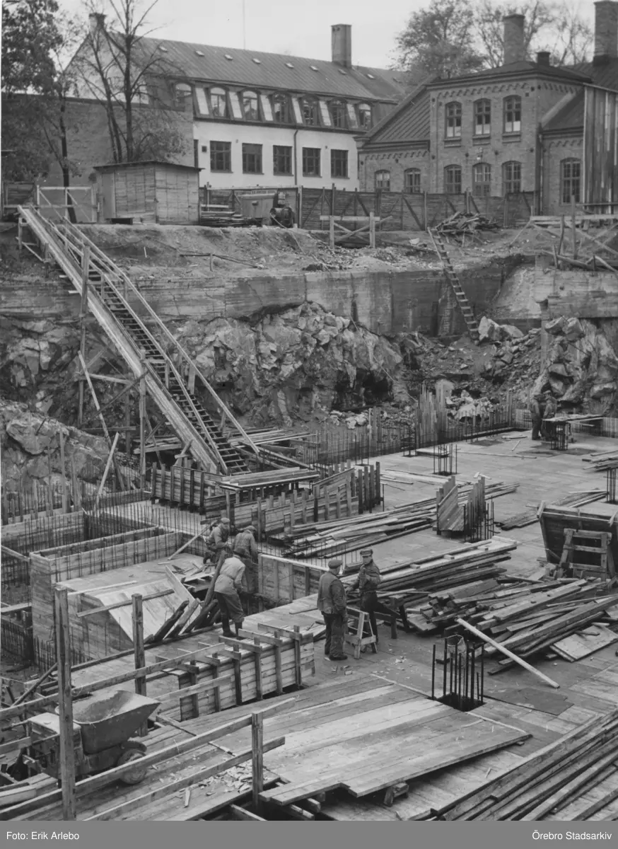 Byggarbetare jobbar på polishusets bygge, 1955-10-28