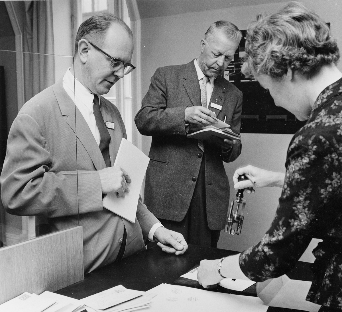 I moderna postkontoret, på 2 trappor, stämplar överpostexpedi-tör
