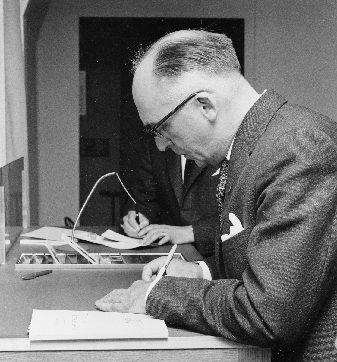 har inhandlat frimärken och skriver brev i moderna postkon- toret på