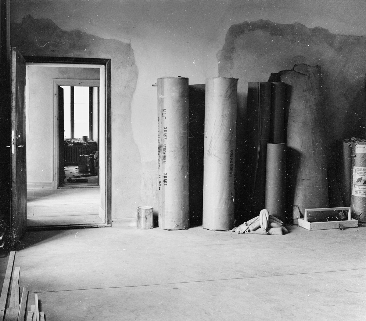 Trapphallen med dörr till blivande 1850-års postkontor. I fonden
