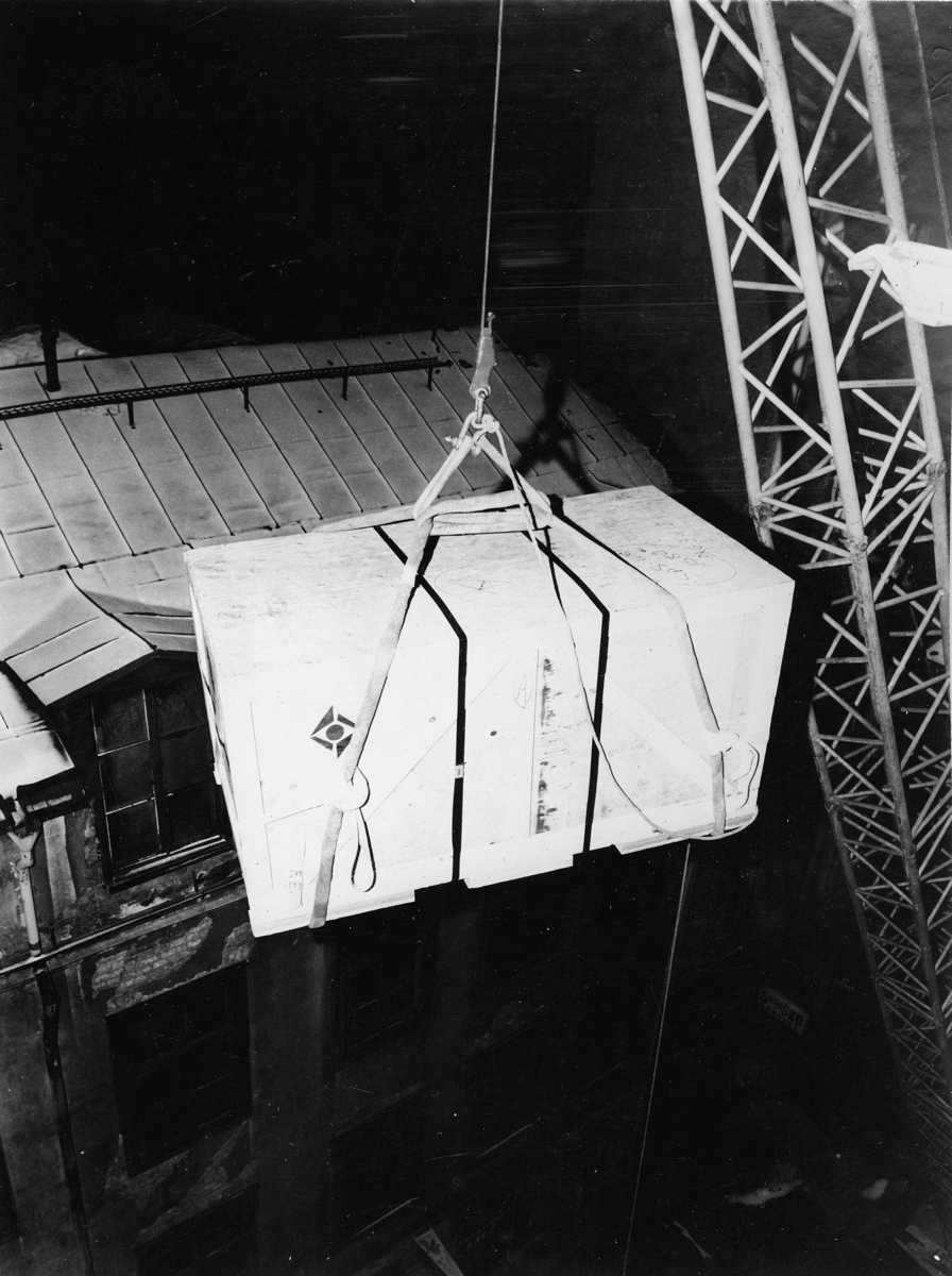 En jättelyftkran hissade upp maskinerna till fjärde våningen i Postgirohuset, från Bryggargatan.