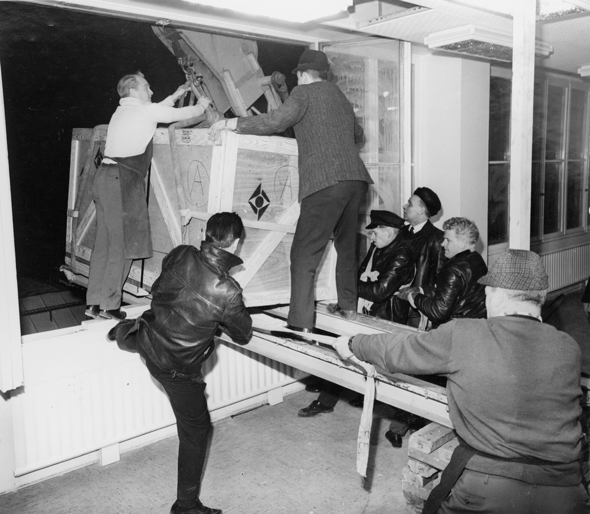 Många starka armar behövdes för att baxa in de stora lådorna genom fönstret, från Bryggargatan, till Postgirohusets fjärde våning.